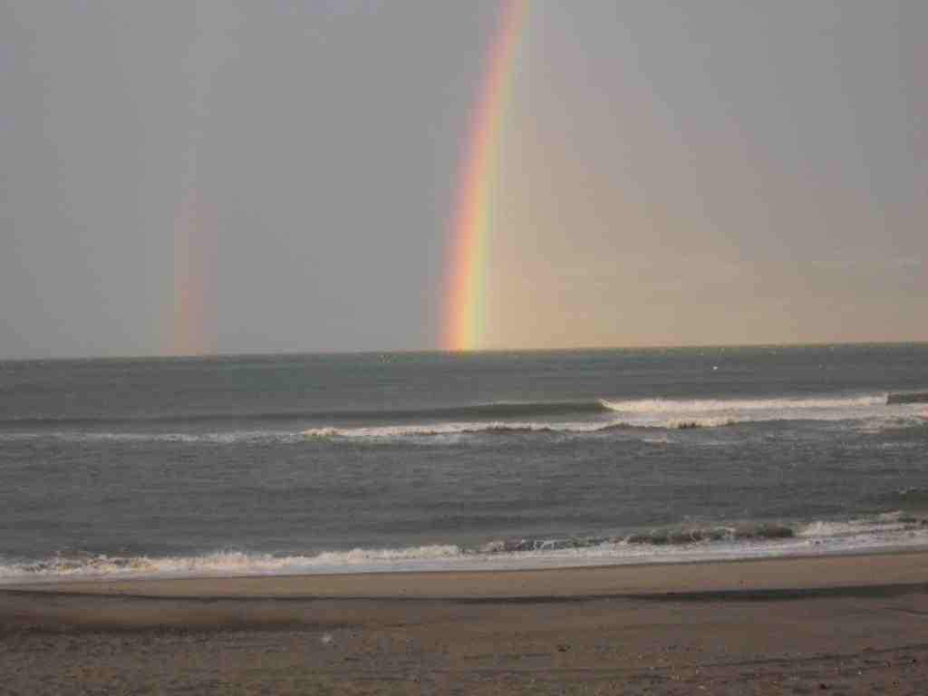 Zur Schlafstätte erkor ich dann einen Parkplatz direkt am Meer aus, auf dem erfreulicherweise kein No-Camping-Schild stand. Kurz nach meiner Ankunft gab es ein paar kurze Schauer, die einen ziemlich großen Regenbogen zur Folge hatten, dessen eines Ende direkt auf dem Meer war! Hatte ich auch noch nicht gesehen, war aber sehr schön. Das fanden offenbar viele Vorbeifahrende auch, denn innerhalb von ein paar Minuten füllte sich der Parkplatz mit Schaulustigen. Da denkt man immer, es gibt gar nicht so viele Neuseeländer, aber kaum gibt es was zu sehen, schon kommen sie alle an. Nachdem die Sensationsgier abgeklungen war, war ich wieder allein, konnte dann später aber zumindest auch ungestört schlafen.
