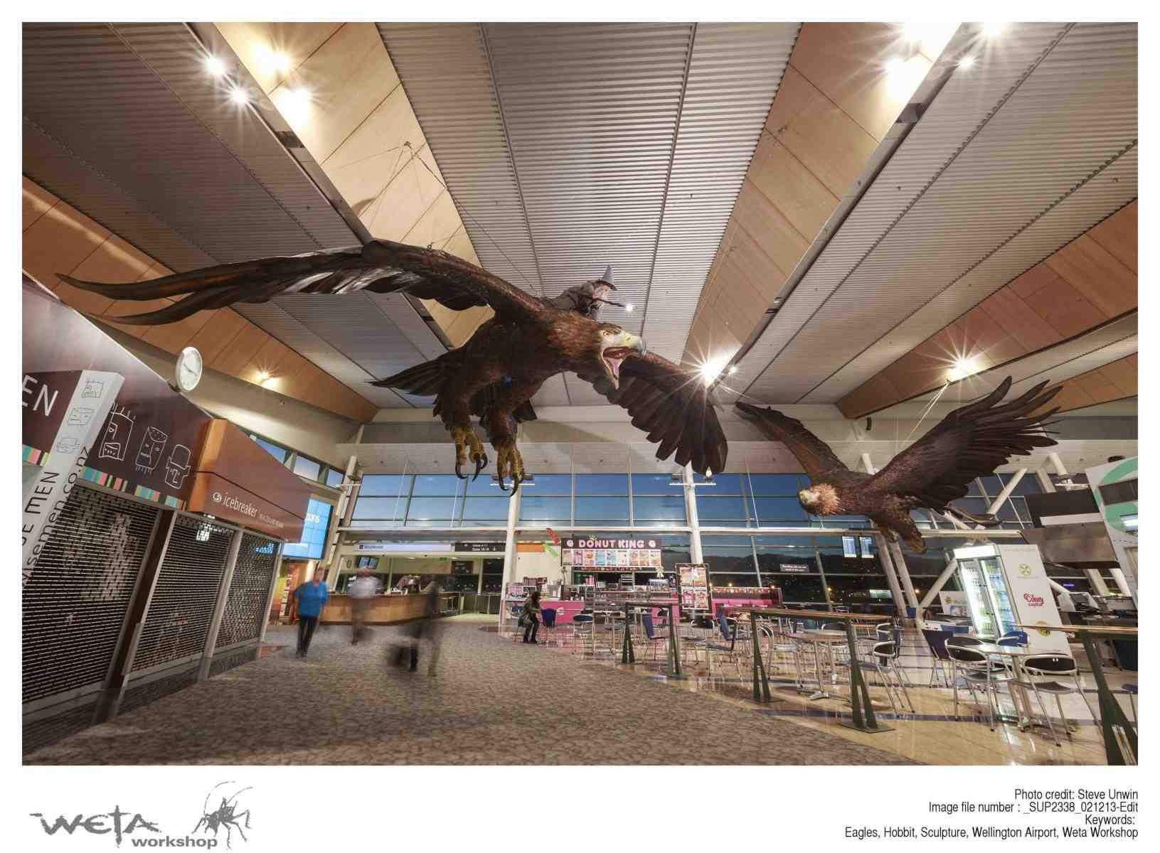 Ankommende am Internationalen Flughafen Wellington werden von zwei großen Adlern, die Gandalf einfliegen, begrüßt und ergänzen damit Gollum, der schon länger am Flughafen steht. Die Adler haben jeweils eine Spannweite von 15 Metern und wiegen über 1 Tonne. Über 1000 Federn wurden einzeln hergestellt, um die Vögel möglichst echt aussehen zu lassen. Ob auch wieder Visa-Stempel mit dem Schriftzug „Welcome to Middle Earth“ ausgegeben werden, ist eher unwahrscheinlich, da die große Premiere ja nicht dort stattfindet. Allerdings wird es viele kleinere Veranstaltungenund eine Menge Herr der Ringe/ Der Hobbit Produkte geben.